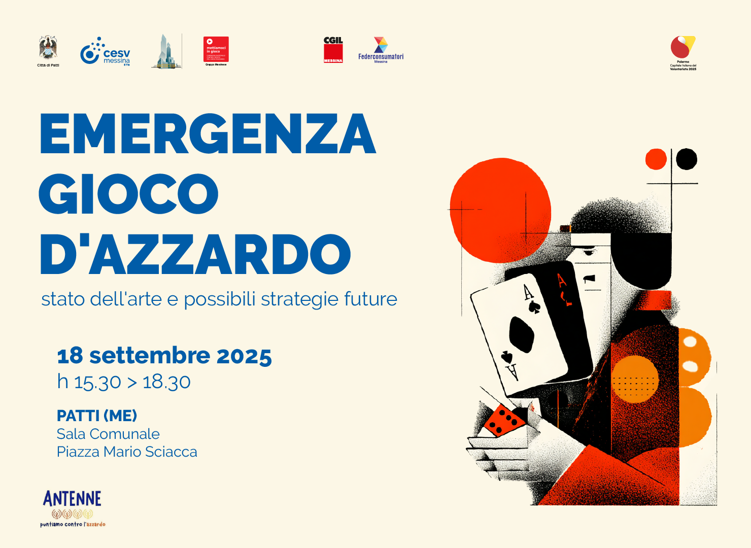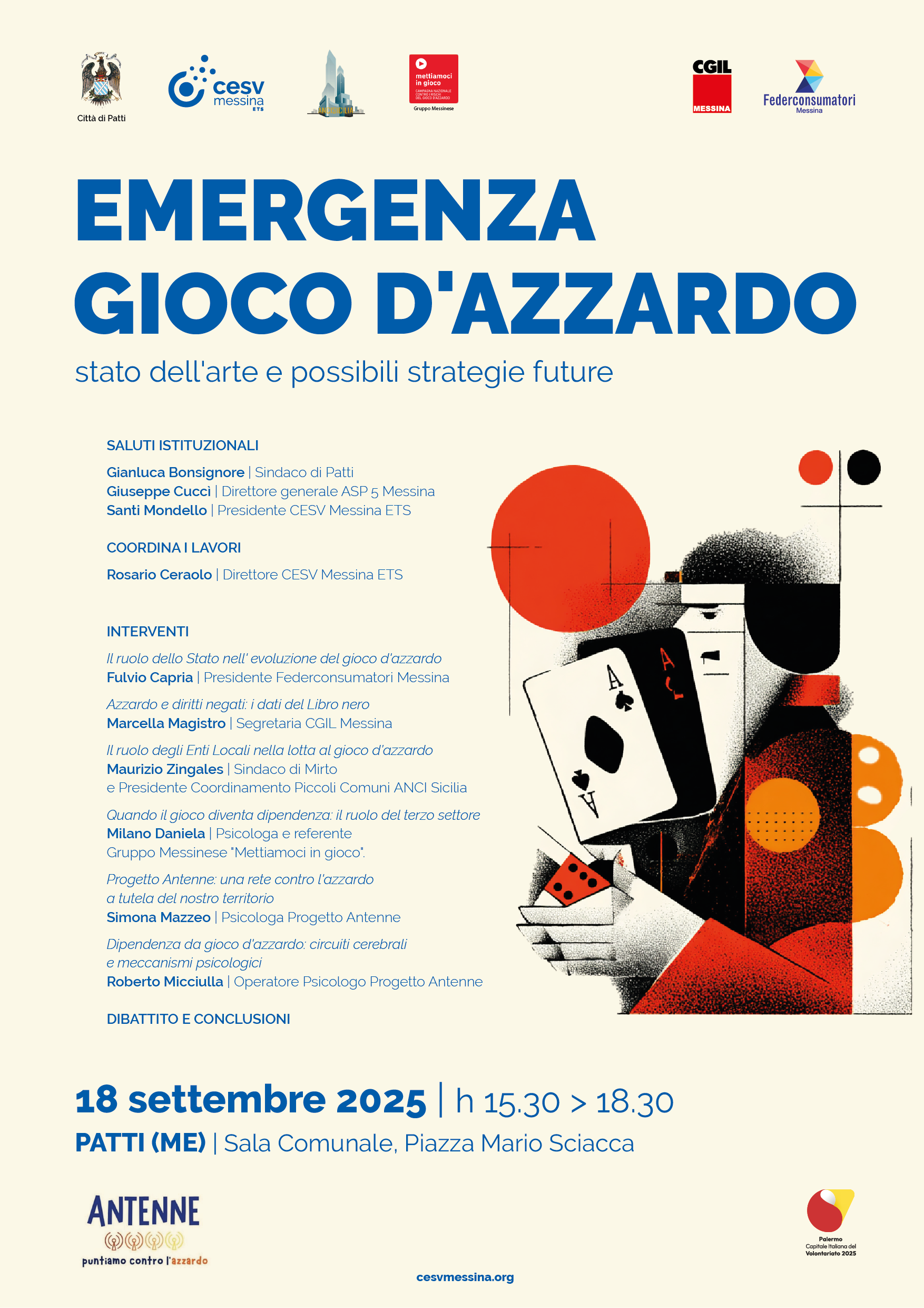 Il seminario nasce dall’incontro tra le realtà promotrici, che hanno condiviso l’urgenza di riflettere insieme sul tema, anche alla luce dello studio elaborato da Federconsumatori e CGIL che segnala il territorio di Patti e la provincia di Messina tra quelli con la maggiore incidenza del fenomeno. L’appuntamento vuole essere quindi un momento di confronto e sensibilizzazione, capace di stimolare nuove strategie di prevenzione e di tutela delle comunità locali, in un’ottica di corresponsabilità tra istituzioni, terzo settore e cittadini.