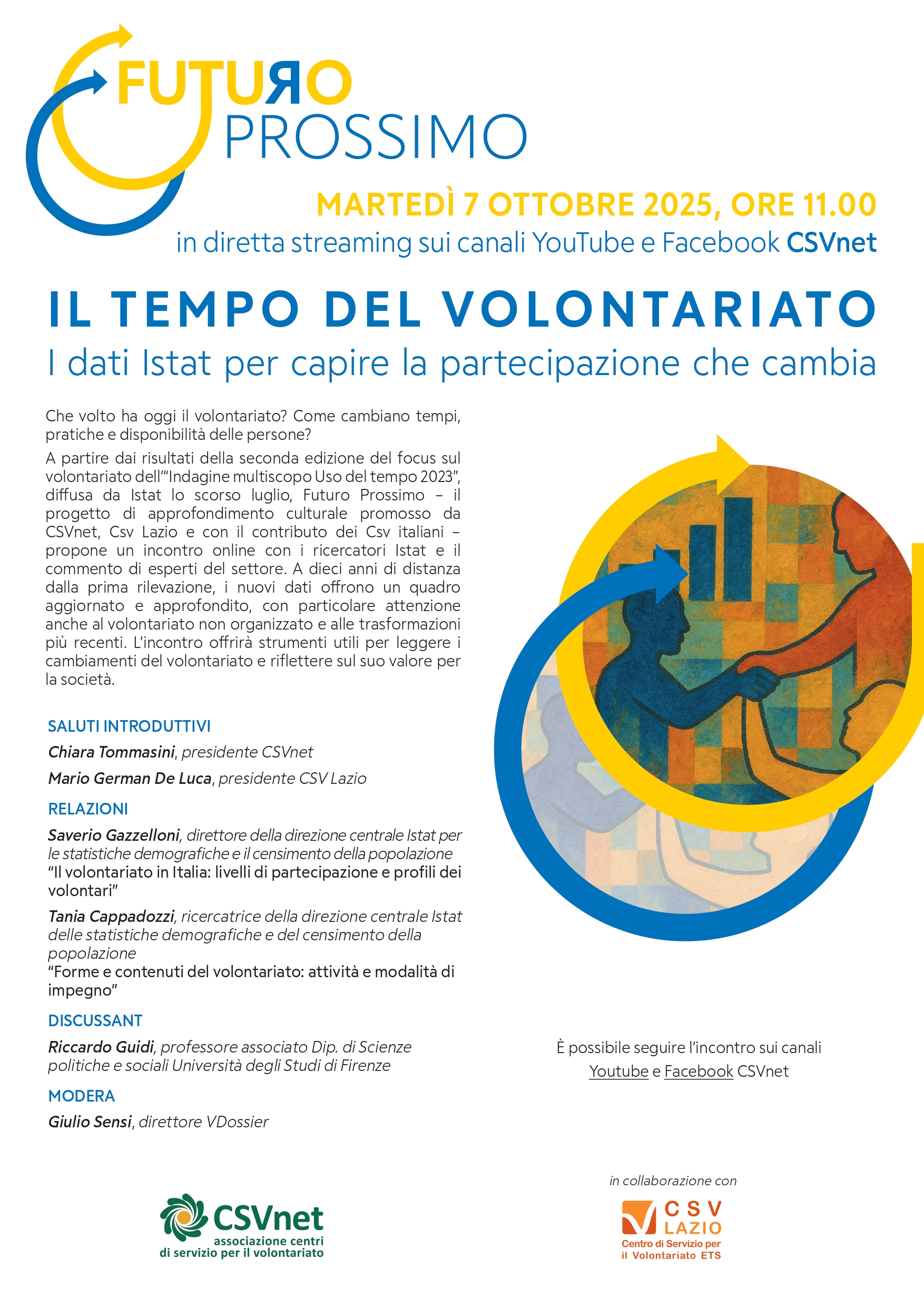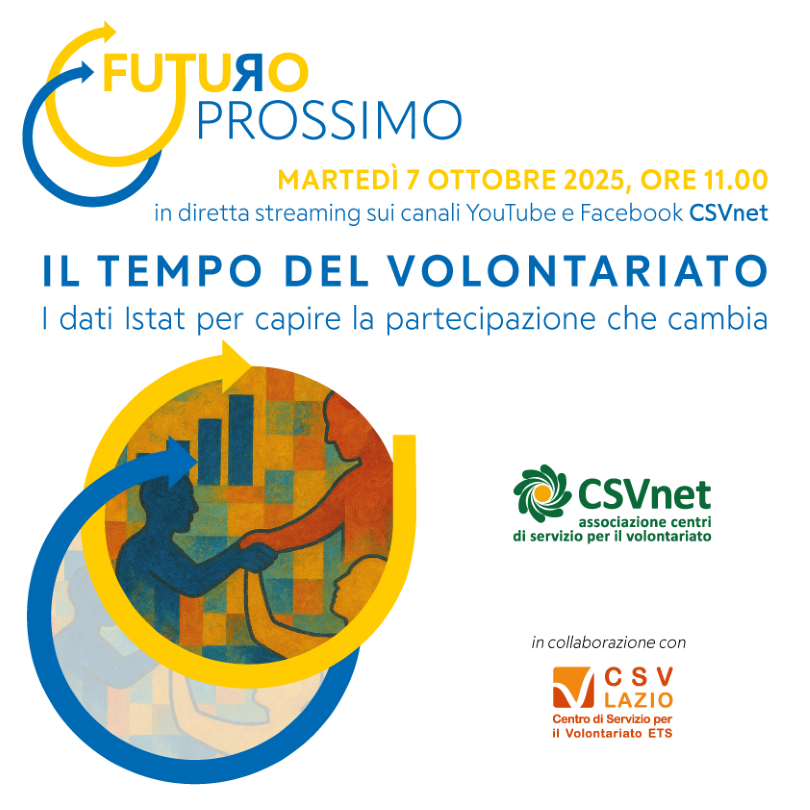 Martedì 7 ottobre alle ore 11 sarà trasmesso in diretta streaming l’incontro online “Il tempo del volontariato. I dati Istat per capire la partecipazione che cambia”, promosso da CSVnet e CSV Lazio nell’ambito del progetto di approfondimento culturale “Futuro Prossimo.