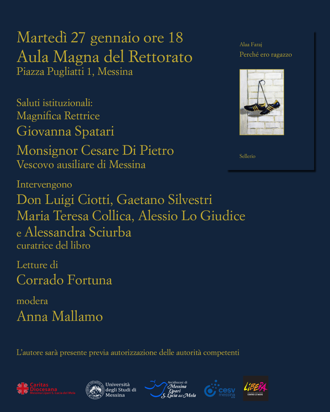 Promosso da Caritas Messina, Università di Messina, Arcidiocesi di Messina, Libera e CESV, si terrà il 27 gennaio alle ore 18:00 nell’aula magna del Rettorato (piazza Pugliatti 1, Messina) la presentazione del libro “Perché ero ragazzo” di Alaa Faraj, edito da Sellerio.