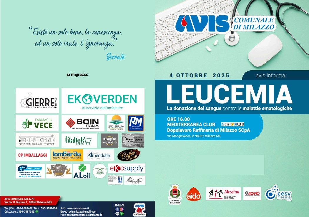 Leucemia. La donazione del sangue contro le malattie ematologiche” è il titolo del convegno regionale promosso dall’Avis Comunale di Milazzo che avrà luogo il 4 ottobre alle ore 16:00 al Mediterranea Club – Dopolavoro Raffineria di Milazzo SCpA (Via Mangiavacca 2, Milazzo).