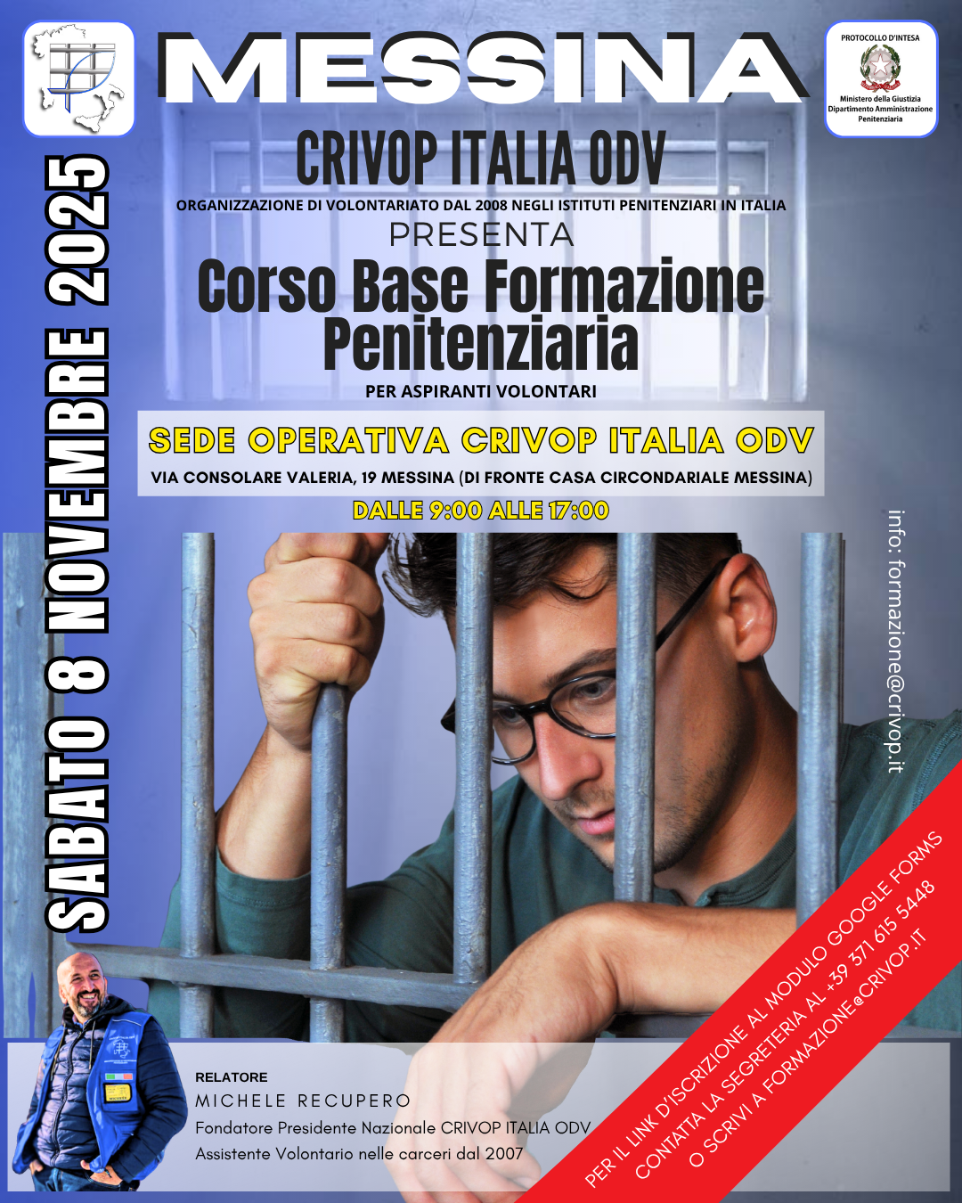 Il corso base formazione penitenziaria si terrà sabato 8 novembre dalle ore 09:00 alle ore 17:00 nella sede operativa in Via Consolare Valeria 19, Messina, di fronte alla Casa Circondariale e sarà curato da Michele Recupero, fondatore e presidente di CRIVOP Italia OdV e volontario nelle carceri dal 2007. Per informazioni: Segreteria Formazione (Lidia), Tel. +39 3716155448, email: formazione@crivop.it.