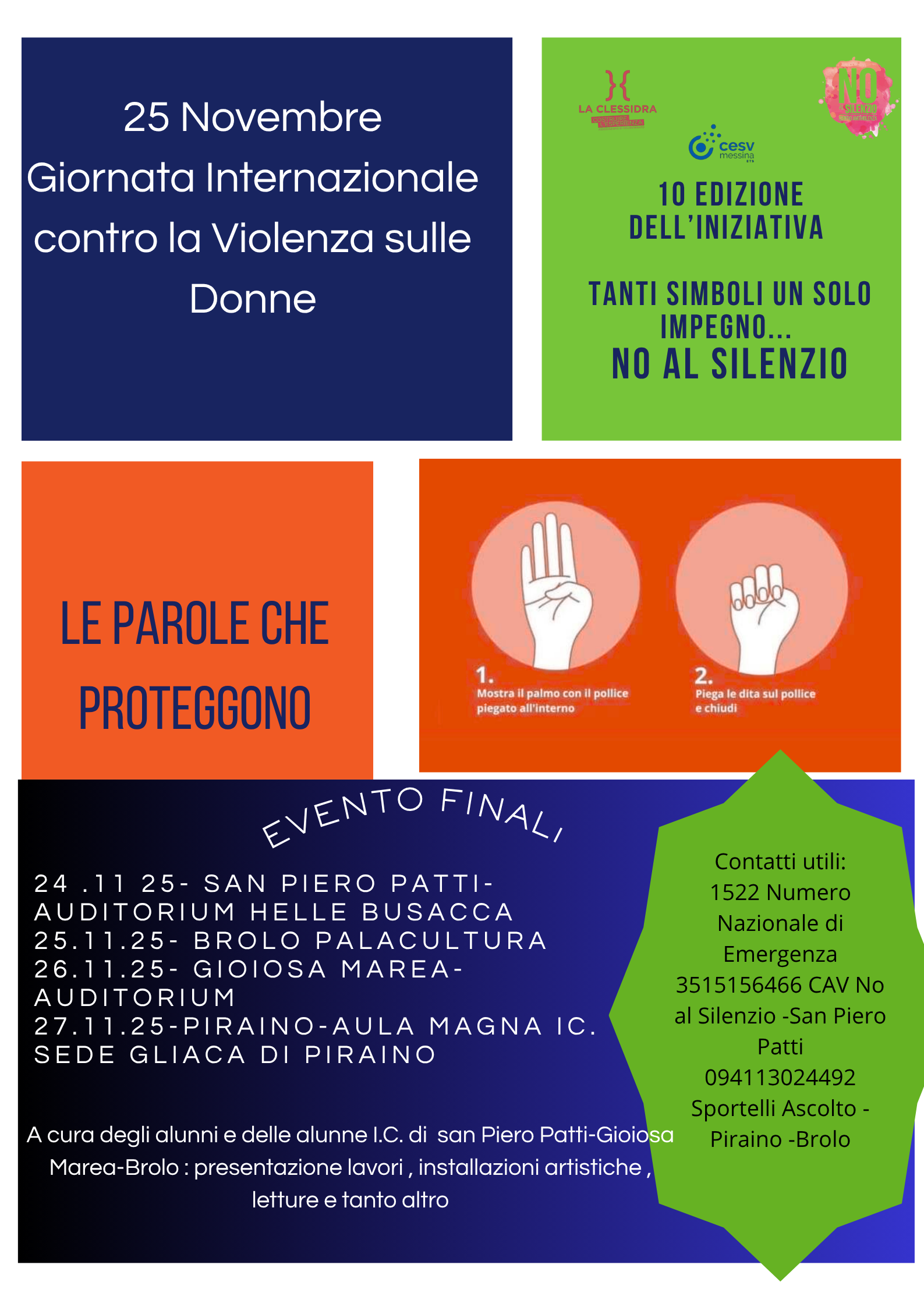 In programma il  24 novembre a San Piero Patti, il 25 novembre a Brolo, il 26 novembre a Gioiosa Marea e il 27 novembre a Piraino gli eventi finali della decima edizione di “Tanti simboli, un solo impegno… No al silenzio”, dal titolo “Le parole che proteggono – Un percorso contro la violenza e per il rispetto reciproco”. La manifestazione è organizzata dall’Associazione “La Clessidra” – CAV No al Silenzio di San Piero Patti.