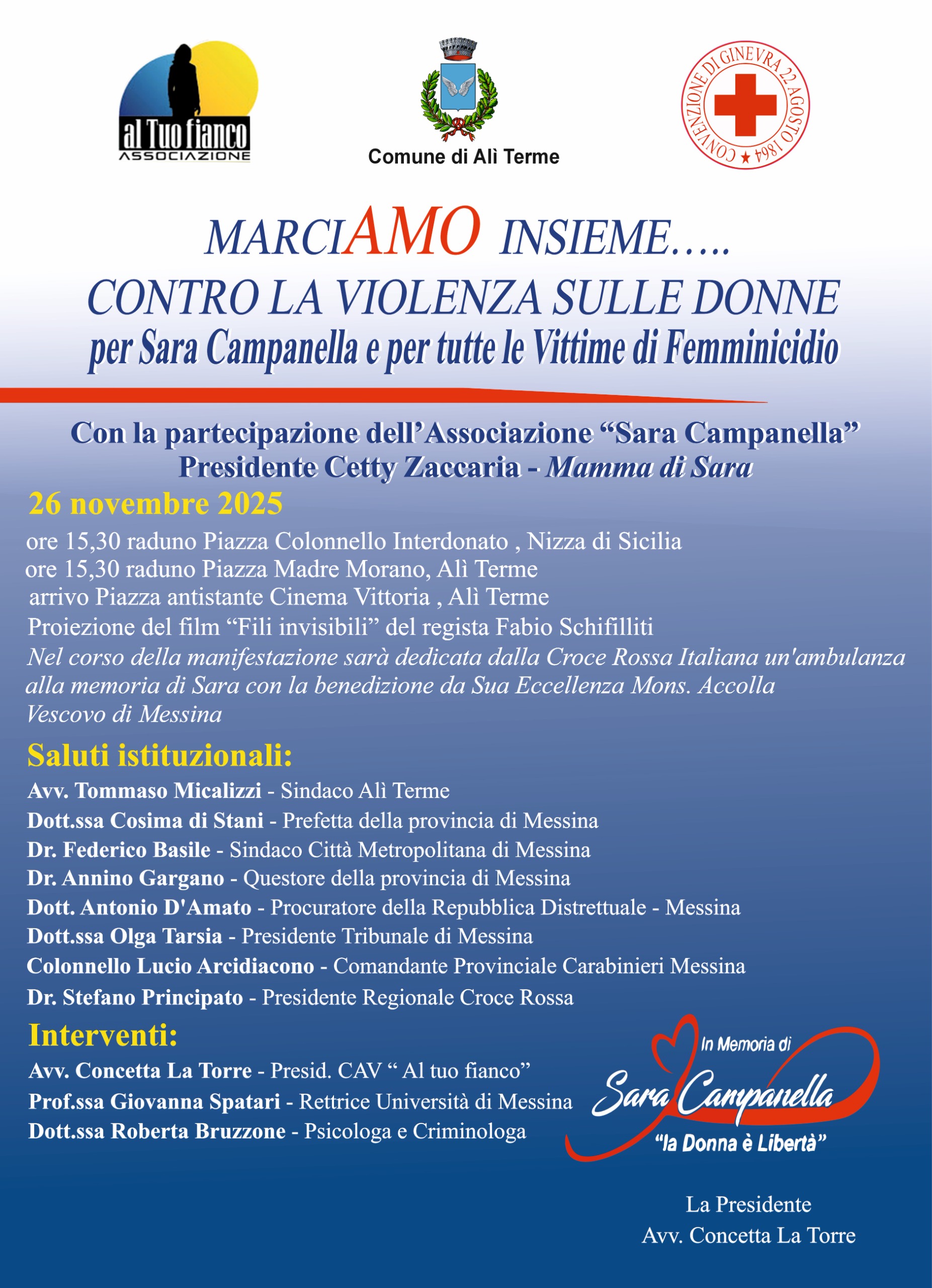 Organizzato dall’associazione Al tuo fianco con il Comune di Alì Terme e con la partecipazione dell’associazione Sara Campanella domenica 26 si terrà la manifestazione “MarciAMO insieme contro la violenza sulle donne… per Sara Campanella e tutte le vittime di femminicidio”.