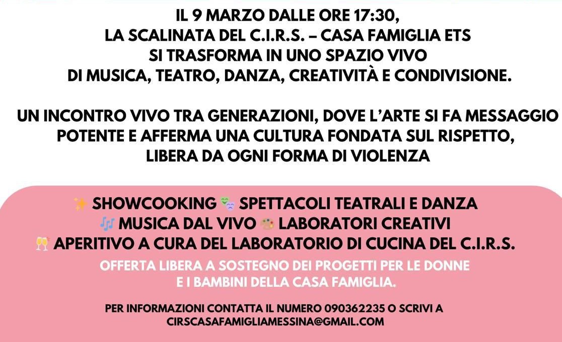 Promosso dal CIRS – Comitato Italiano reinserimento Sociale – Casa Famiglia – ETS – l’evento “Arte e bellezza: il linguaggio delle donne”, che si terrà lunedì 9 marzo a partire dalle ore 17:30 presso la sede di Via Mons. Francesco Bruno 22, Messina.