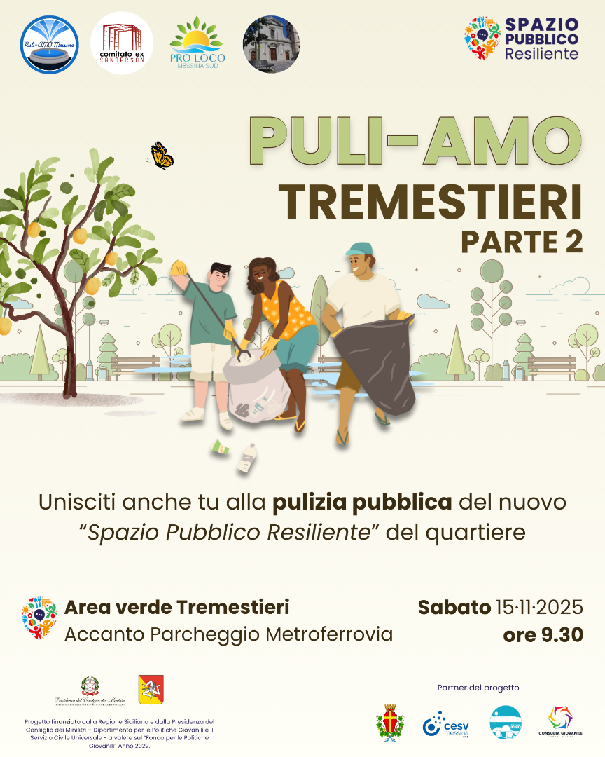 Il progetto S.P.R. – Spazio Pubblico Resiliente è promosso da Puli-AMO Messina, in partenariato con il Comune di Messina, il CESV Messina, l’Associazione Ionio e la Consulta Giovanile di Messina, ed è finanziato dalla Regione Siciliana nell’ambito del bando “Giovani e Sostenibilità”.