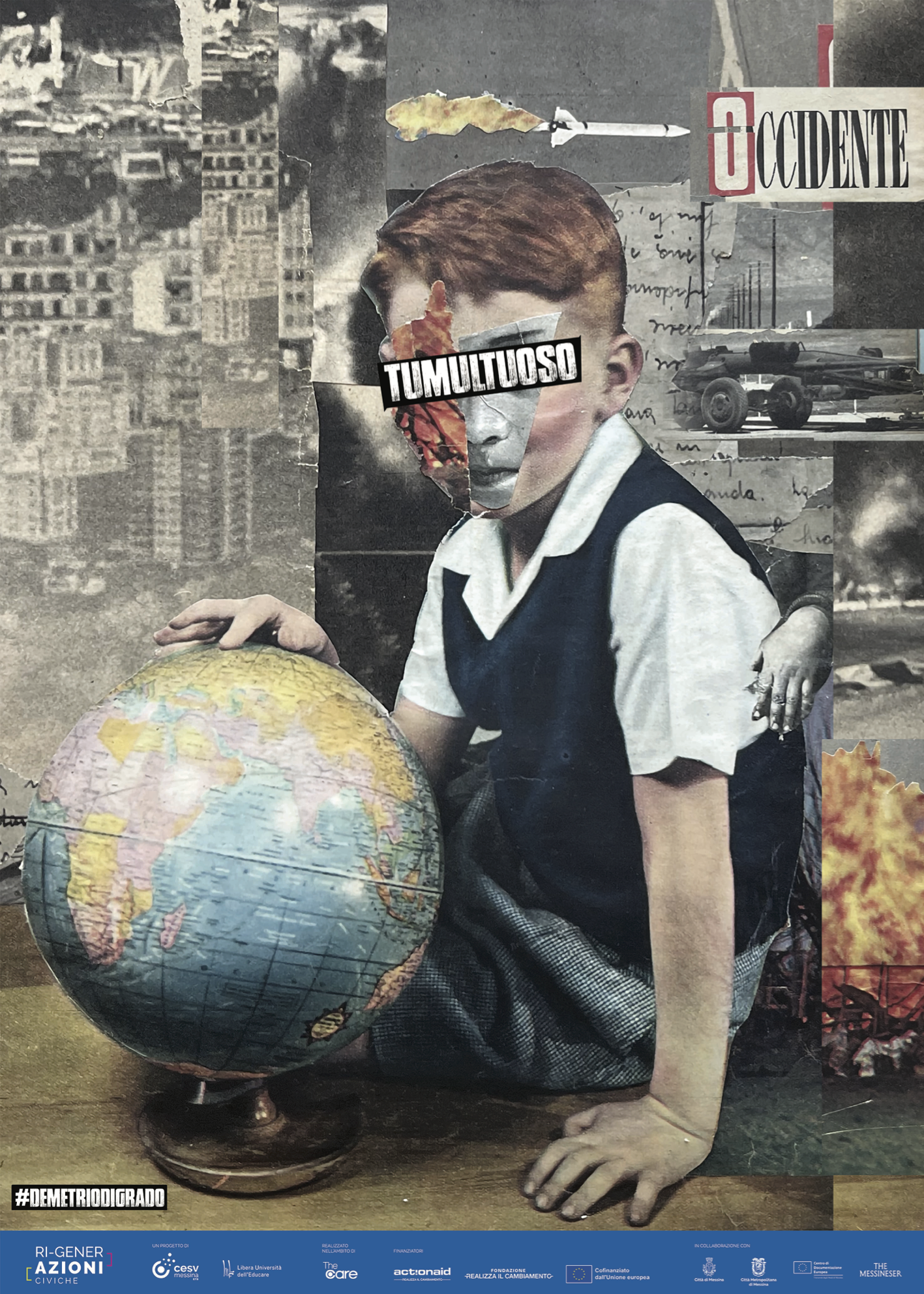 “Tumultuoso” di Demetrio Di Grado interpreta artisticamente il tema della pace attraverso un collage ottenuto assemblando immagini tratte perlopiù da riviste pubblicate tra gli anni ’30 e gli anni ’60 del Novecento. Immagini che restano intatte nella loro identità ma ri-contestualizzate in un processo di attualizzazione semantica.