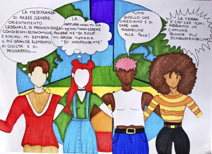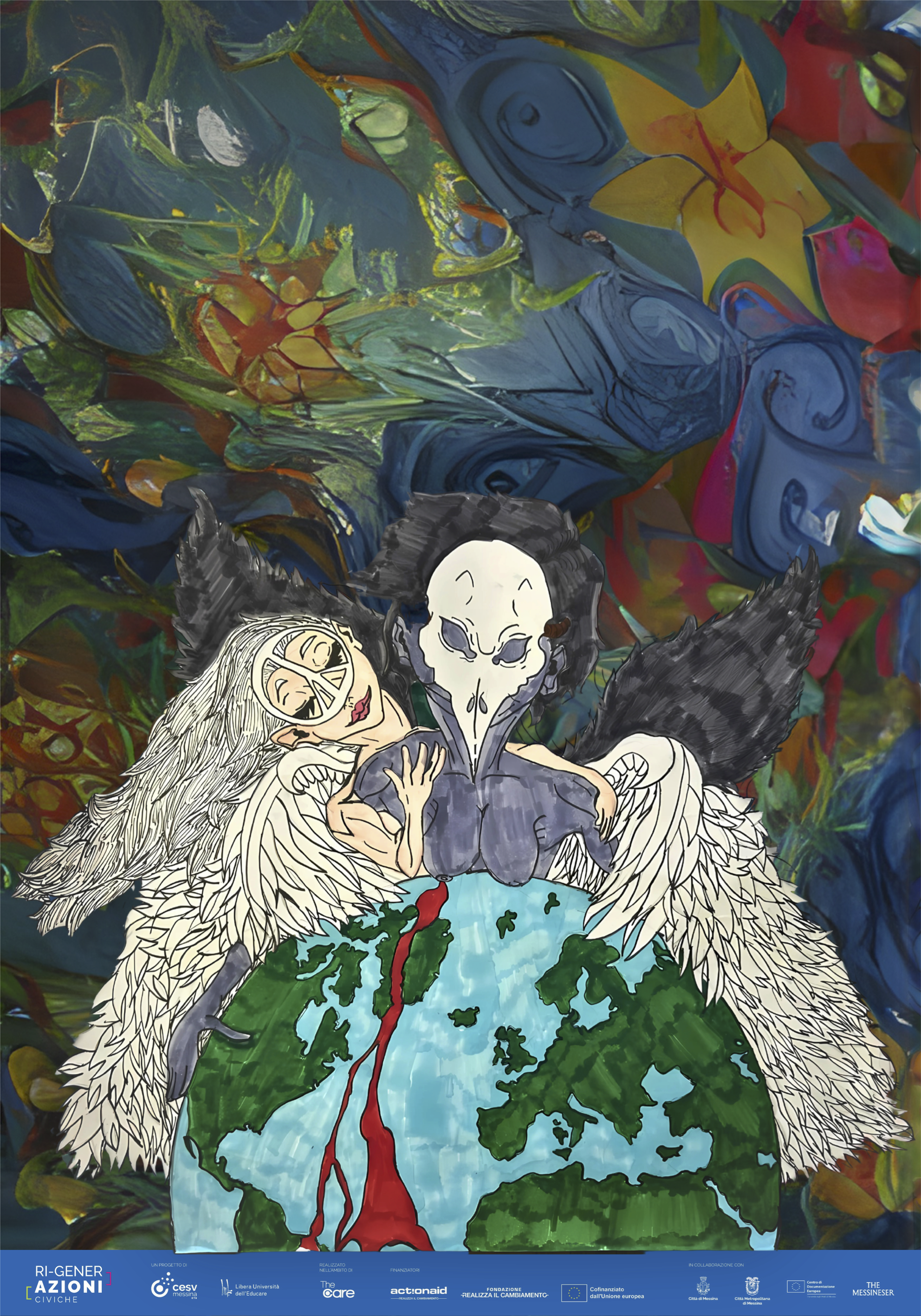 “World caress” di Rachele Mangraviti è un’illustrazione che rappresenta artisticamente il tema pianeta, in particolare il cambiamento climatico inteso come un’altra delle questioni che i giovani avvertono come una concreta minaccia per il futuro loro e dell’intera umanità.